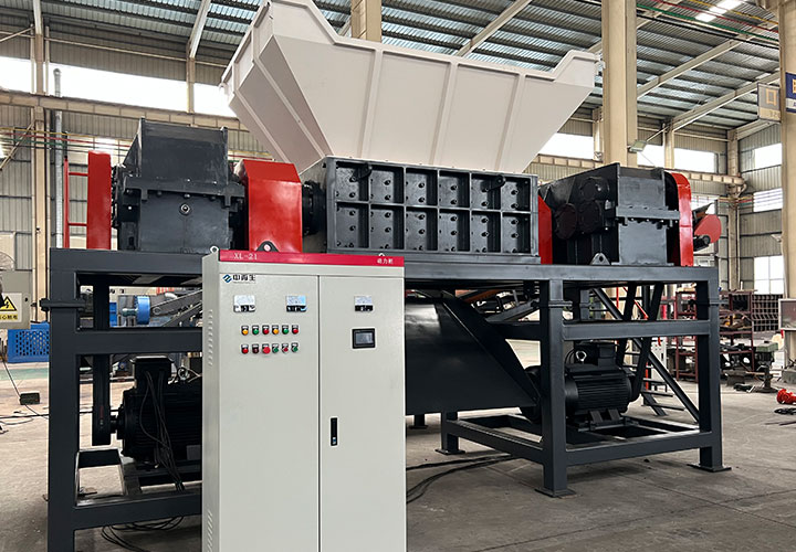 破碎线主机壳体采用特厚钢板制造,内衬为高锰铸钢件,可更换;主机转子盘安装于水平轴上,转子盘圆周分布有销轴,轴向悬有锤头;主轴用滚珠轴承支撑,循环油强制润滑冷却,并装有温度传感器;进料口装有液压辊筒喂料装置,位置一高一低,同向旋转,能将大件松散物料压扁,送入破碎腔内。