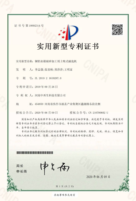 ZL2019216192870铜铝水箱破碎加工用上吸式磁选机